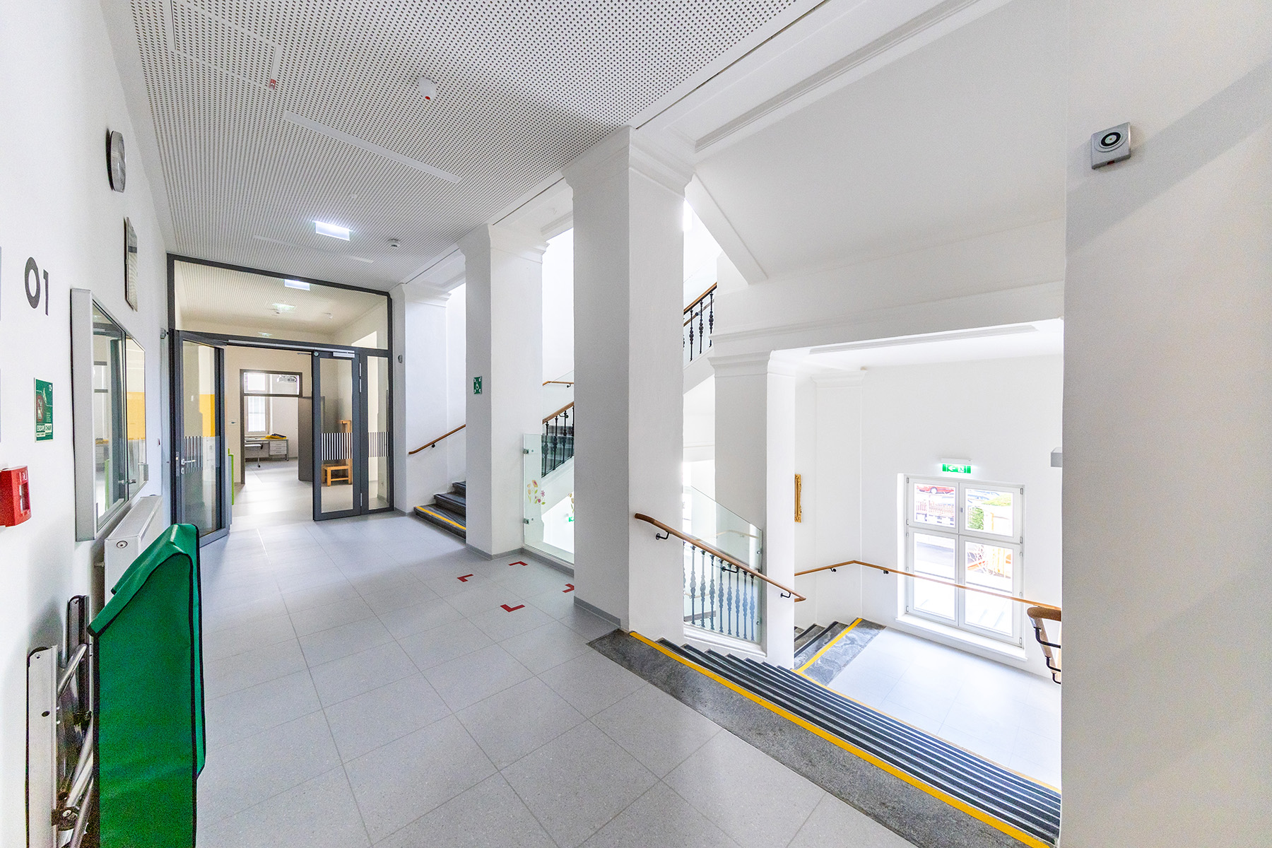 Schwächen des Bestands wurden behoben, sodass das Gebäude nun in puncto Sicherheit einem Neubau ebenbürtig ist. Großer Wert wurde auch auf hohe raumakustische Qualität sowie auf eine zeitgemäße technische Infrastruktur gelegt, mit neuer Heizungs- und Wasserinstallation, EDV-Versorgung, automatisch geregelter, energiesparender Beleuchtung bis hin zu den interaktiven Schultafeln.