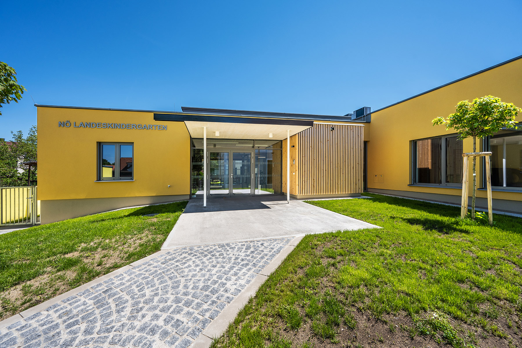 Über den Bewegungsraum wird der Kindergarten intern mit der benachbarten Volksschule verbunden. Dank großzügiger und unterschiedlicher Sichtbeziehungen ist die Wegführung sehr übersichtlich. Durch die Gliederung der Baukörper entstehen räumlich interessante Außenbereiche, die zusätzliche Nutzungsmöglichkeiten anbieten.