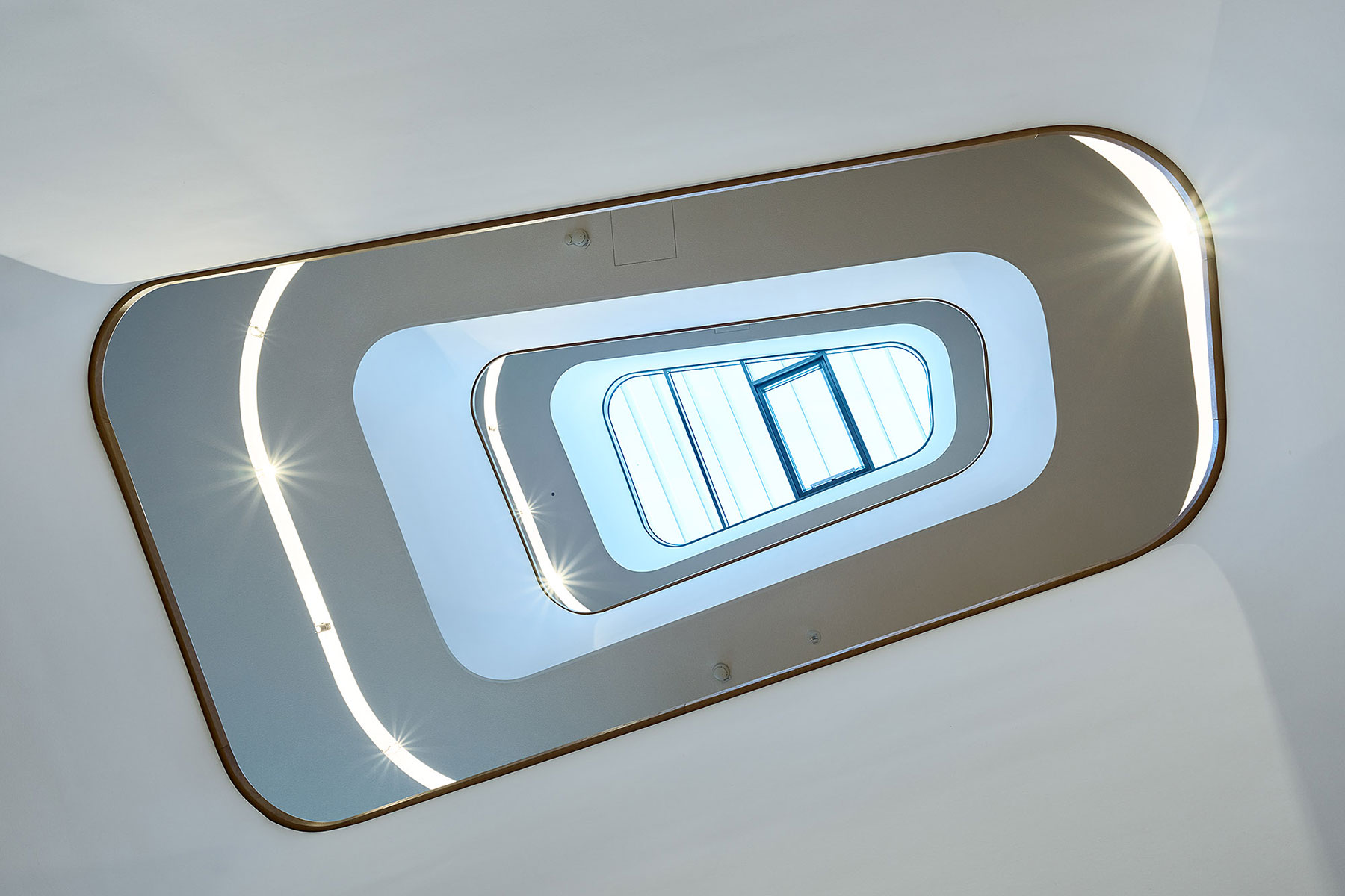 Der Haupteingang führt in eine zentrale Halle, von der aus die Amtsräumlichkeiten, Serviceeinrichtungen und die Arztordinationen erschlossen werden. Die Büros sind großzügig dimensioniert, flexibel bespielbar und durch Möbelwände, die auch als Stauräume dienen, voneinander abgetrennt. Ein Luftraum in der Mitte erstreckt sich über alle drei Geschoße und wird von einem Glasoberlicht bekrönt. Dieses Element bringt nicht nur mehr Licht, sondern verbindet auch die Geschoße zu einer räumlichen Einheit.
