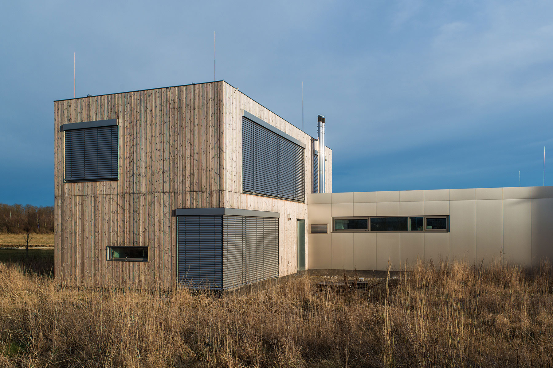 Der eingeschoßige, mit einer hinterlüfteten Aluminiumfassade bekleidete Ordinationstrakt öffnet sich zur Straße hin und schirmt gleichzeitig den an der Grünlandgrenze liegenden Wohnbereich ab, wodurch für diesen ein hohes Maß an Privatheit erzielt wird.