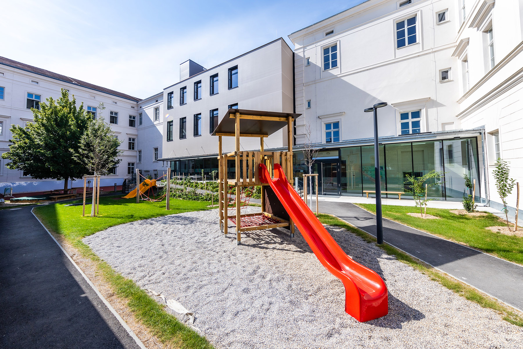 Um den Schulhof nicht einzuengen, sondern Außen und Innen miteinander zu verbinden, ist das Erdgeschoß komplett verglast.