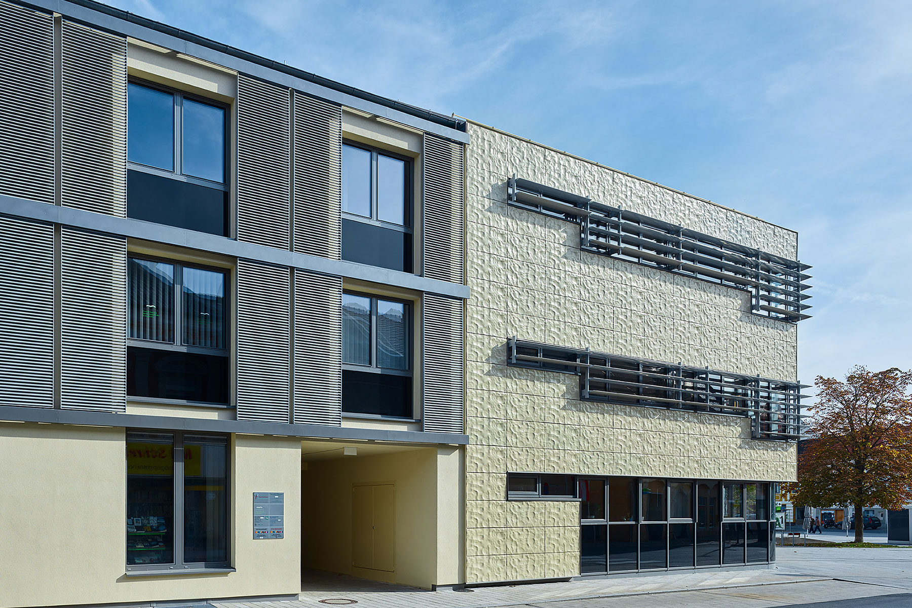 Der vorliegende Entwurf reagiert subtil auf das Volumen und die Höhenentwicklung der Umgebung und leistet einen baukulturellen Beitrag zur Gegenwartsarchitektur. Durch die Möglichkeit, bei gleichbleibender Traufenhöhe ein Geschoß mehr als bisher unterzubringen, wurde der Gebäudeteil zum Rathausplatz hin abgetragen und durch einen Neubau ersetzt. Der Trakt, der die Stadtbibliothek und das Bauamt beherbergt, wurde umgebaut und soll als Fachärztehaus genutzt werden.